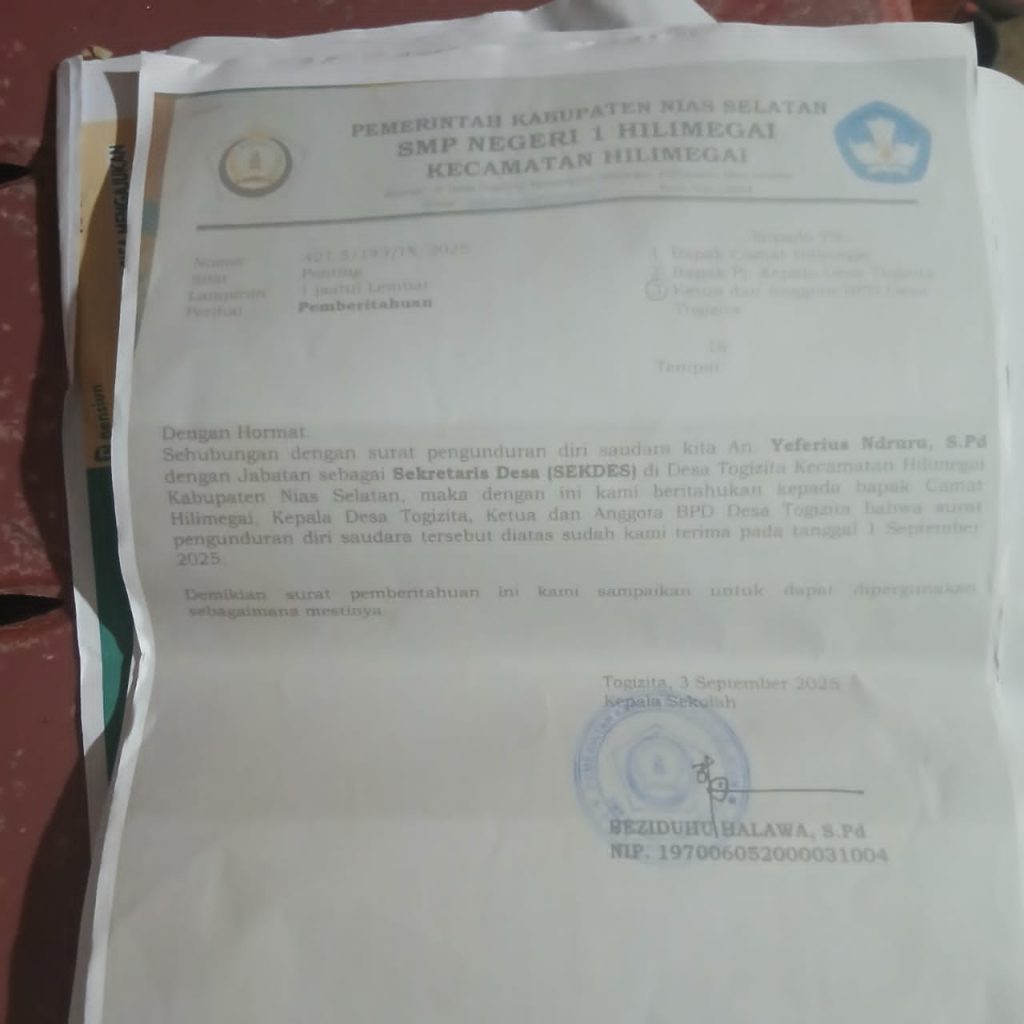 Namun, menurut FR, pengunduran diri itu tidak digubris oleh PJ Kades Apolonias. Bahkan, diduga ada upaya penyalahgunaan jabatan dan manipulasi dokumen perjanjian di lingkungan Dinas Pendidikan melalui UPTD SMPN 1 Hilimegai.