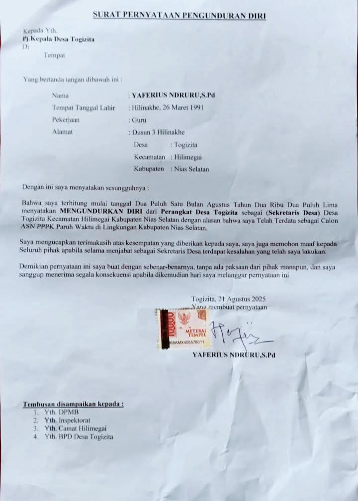 Yaferius sendiri sudah menyatakan mundur dari jabatannya sebagai Sekdes Tegizita melalui surat pernyataan resmi tertanggal 21 Agustus 2025 yang ditujukan ke Dinas Pendidikan Kabupaten Nias Selatan. Alasan pengunduran diri tersebut lantaran dirinya terdata sebagai calon ASN PPPK paruh waktu di lingkungan SMPN 1 Hilimegai. Surat tersebut ditembuskan kepada Kades Tegizita dan Camat Hilimegai.