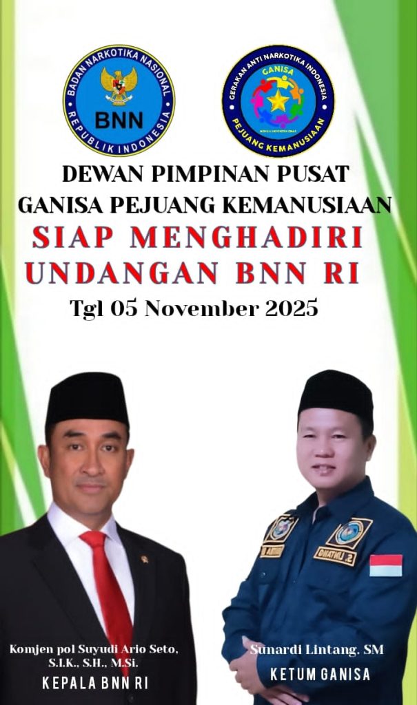 JAKARTA — Dewan Pimpinan Pusat (DPP) Ganisa Pejuang Kemanusiaan menyatakan kesiapan menghadiri undangan resmi dari Badan Narkotika Nasional Republik Indonesia (BNN RI) pada 5 November 2025 mendatang. Pertemuan ini diyakini akan menjadi momentum penting dalam memperkuat sinergi antara lembaga negara dan organisasi masyarakat dalam upaya nasional pemberantasan dan pencegahan narkotika.