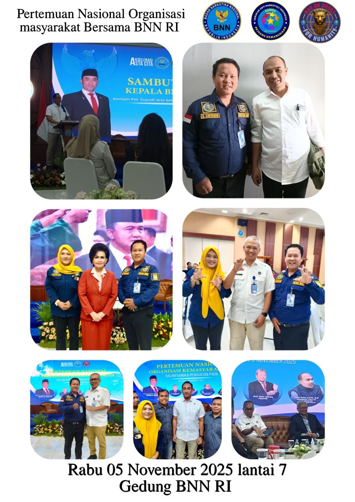 Jakarta, 5 November 2025 — Dalam agenda strategis Badan Narkotika Nasional Republik Indonesia (BNN RI) yang digelar di Jakarta, Ketua Umum DPP Ganisa Pejuang Kemanusiaan menghadiri undangan resmi pembahasan strategi Pendampingan dan Pemberdayaan Masyarakat (Dayamas) dalam implementasi Permendagri No. 12 Tahun 2019 tentang Fasilitasi P4GN (Pencegahan dan Pemberantasan Penyalahgunaan dan Peredaran Gelap Narkoba).