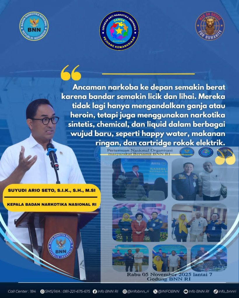 BNN RI bersama Dewan Pimpinan Pusat Ganisa Pejuang Kemanusiaan melalui kampanye nasional #WarOnDrugsForHumanity menegaskan pentingnya kewaspadaan masyarakat terhadap peredaran narkoba generasi baru (New Psychoactive Substances/NPS) yang kini marak beredar dalam bentuk permen, kue, cairan vape, hingga kopi sachet.