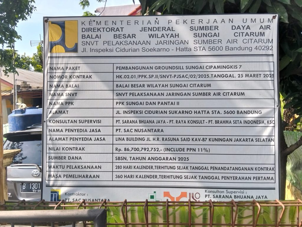 BOGOR, Rajawali Sriwijaya— Proyek pembangunan Groundsill Sungai Cipamingkis Tahap III yang dikerjakan oleh PT SAC Nusantara kini menjadi sorotan publik. Proyek strategis nasional ini memiliki nilai kontrak sebesar Rp86,7 miliar (termasuk PPN 11%) yang bersumber dari Surat Berharga Syariah Negara (SBSN) Tahun Anggaran 2025, dengan masa pelaksanaan 280 hari kalender dan masa pemeliharaan 360 hari kalender.
