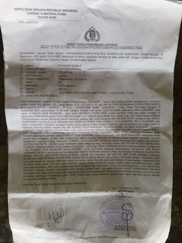 Dairi | LSM KCBI – Kinerja Polres Dairi kembali menjadi sorotan tajam publik. Ketua LSM Komando Cinta Bangsa Indonesia (KCBI) Kabupaten Dairi secara terbuka mengkritik keras penanganan kasus dugaan penganiayaan dan perusakan rumah yang dilaporkan oleh Syahdan Sagala beserta istri dan anaknya ke SPKT Polres Dairi, namun hingga kini terkesan “mengendap tanpa kepastian hukum”.