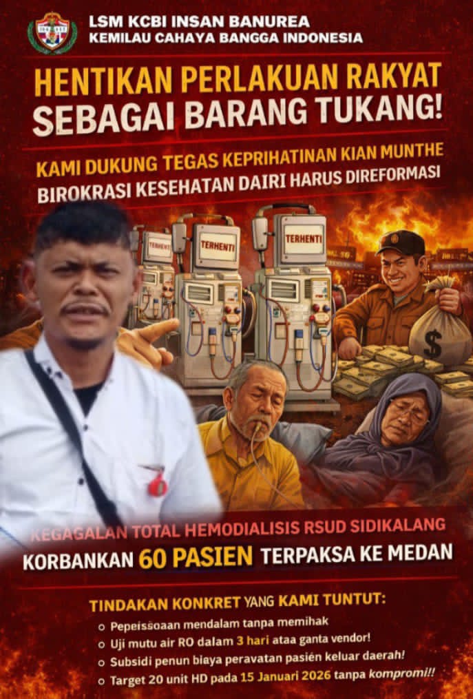 Sidikalang, 13 Januari 2026 – LSM KCBI Insan Banurea Kemilau Cahaya Bangsa Indonesia Kabupaten Dairi menyatakan dukungan yang tak terbantahkan atas suara keras Anggota DPRD Kabupaten Dairi, Kian Munthe, yang mengangkat kasus penarikan mesin Hemodialisis (HD) di RSUD Sidikalang yang telah menjadikan ratusan jiwa sebagai korban birokrasi yang korup dan tidak bertanggung jawab.