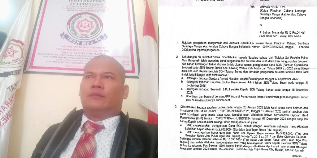 Kinerja penegakan hukum Polres Musi Banyuasin kembali menuai sorotan tajam. Ketua Umum LSM Kemilau Cahaya Bangsa Indonesia (KCBI) melontarkan kritik keras atas Surat Pemberitahuan Perkembangan Hasil Penyelidikan (SP2HP) yang dinilai miskin substansi, lemah analisis, dan gagal menjawab pokok persoalan hukum dalam laporan dugaan penyimpangan Dana BOS di SDN Talang Suhud, Kecamatan Lawang Wetan, Kabupaten Musi Banyuasin.