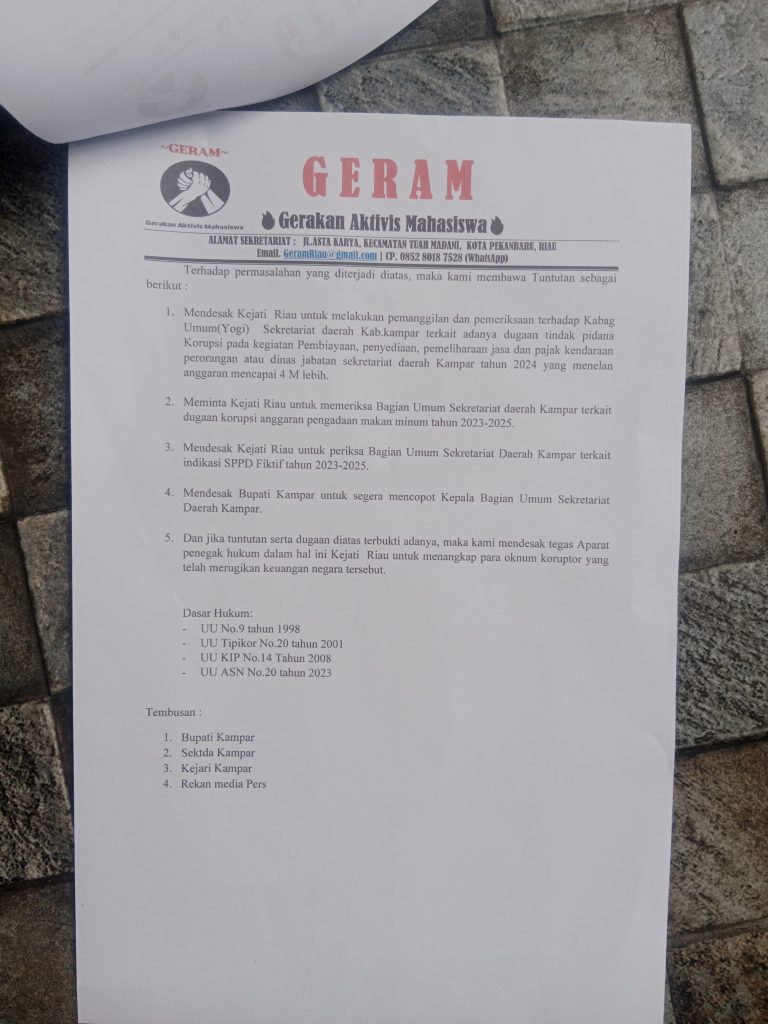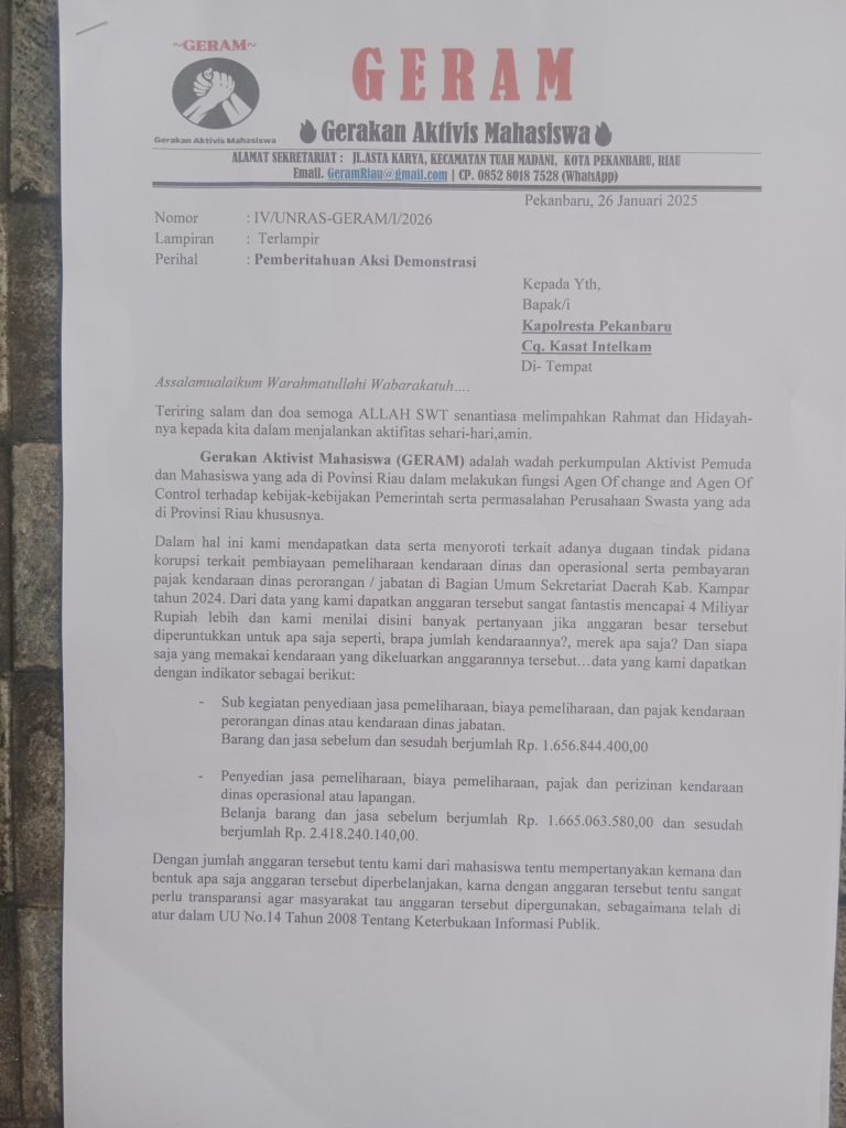 — Gerakan Aktivis Mahasiswa (GERAM) Provinsi Riau menyatakan akan segera menggelar aksi unjuk rasa menyikapi dugaan kuat tindak pidana korupsi dalam pengelolaan anggaran di Bagian Umum Sekretariat Daerah Kabupaten Kampar. Aksi tersebut akan difokuskan pada dugaan penyimpangan anggaran pemeliharaan kendaraan dinas yang nilainya mencapai lebih dari Rp4 miliar pada tahun anggaran 2024.